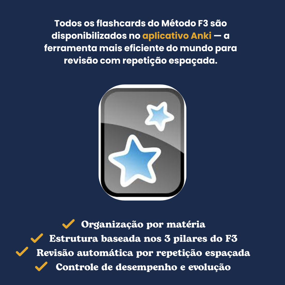 Você recebe os baralhos prontos para utilizar no aplicativo Anki, organizados por matéria e estruturados conforme os 3 pilares do Método F3.